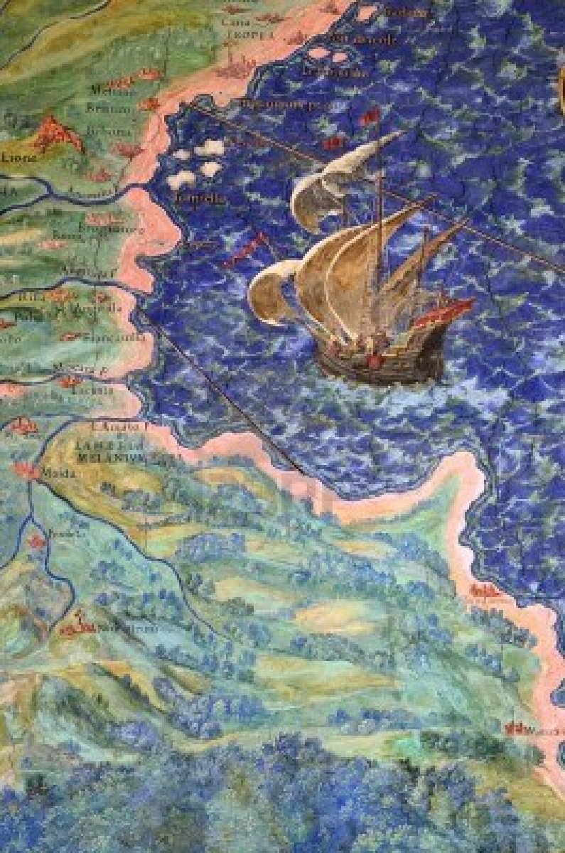 The illusion of a billowing bar of scale hanging from the mast of a ship, just above an aquatic monster, appears at the base of one of forty maps that Fra Egnazio Danti painted of an expansive image of the Italian peninsula.  When the cycle of consecutive painted maps, each three meters wide, was  designed by the mathematician Danti in the Vatican palace at the request of Pope Gregory XIII from 1577 to 1581, a map of “Italy” already existed in print.  But the sequence of maps that were organized in a “Gallery” that allowed the reforming pontiff to view the peninsula and nearby islands.  As much as it embodied a coherently unified territory, or mapped the territory onto the structure of the church, the cycle embodied a vision of the church–although it is often viewed as prefiguring a territorial entity in the peninsula.