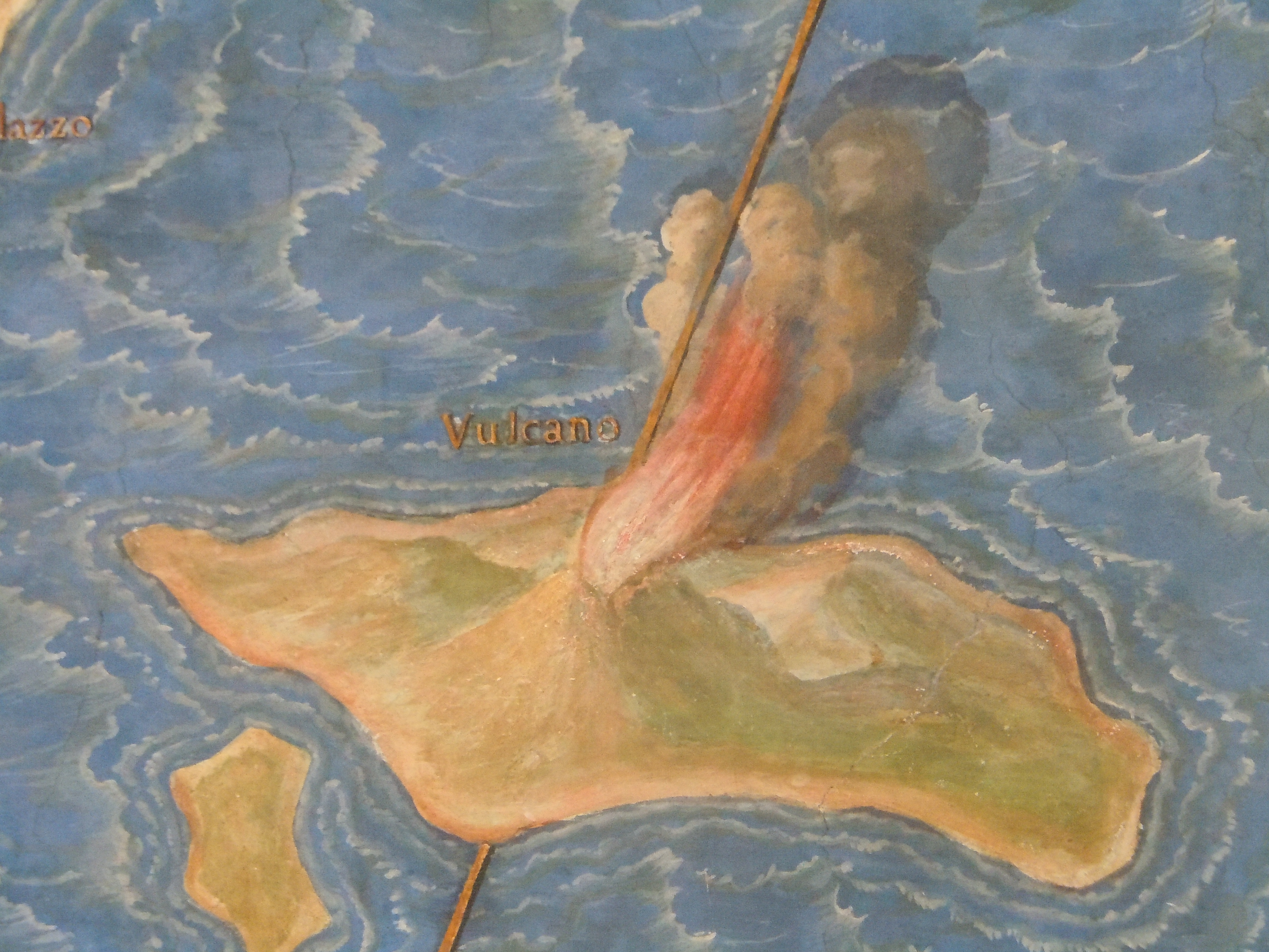 9.  This image of the unity of the ecclesia is perhaps the fundamental achievement of the cycle.  It trumped the very question of terrestrial continuity. Nowhere is this more apparent than in the expansion of a number of surrounding islands among the forty panels that divided the peninsula on the walls of the Gallery.  Many of these islands, like this volcano, are isolated, cut off from the mainland by lapping waves of azure seas.