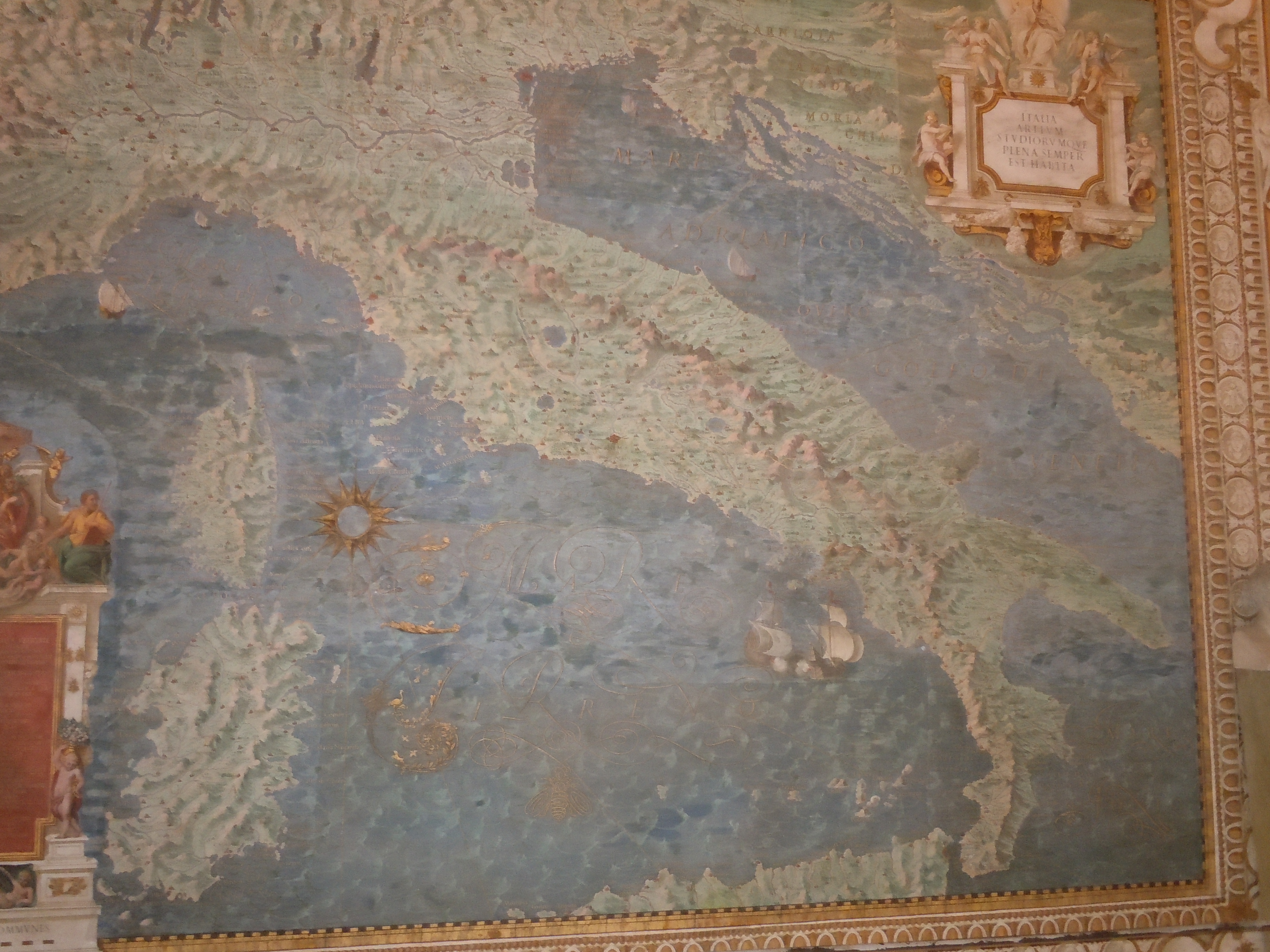 2.  The magnificent corridor dedicated to the Italian peninsula and surrounding islands are the largest freestanding cartographical image of its period.  The cycle offered a new way to map the continuity of a region that predated the coherence of the peninsula, or of course the Italian nation:  it was popular to cartographers of the fascist era in no small part because it assimilated surrounding Mediterranean islands to the image of “Italy” that the Roman pontiff Gregory XIII had ecclesiastically united by a set of resident bishops.  But Danti mapped the coherence of the peninsula not as a state but within the church, at whose apex the Roman pontiff stood.  Danti’s cartographical assemblage reflects the expanding cartographical vision of the early modern world:  based on the surveys Egnazio Danti had personally conducted a limited region in the peninsula, joined to a synthesis of existing maps, and painted by several hands; the dramatic multiplication of maps on the walls of the magnificent gallery reflect the proliferation of printed maps of the peninsula and the world in early modern Europe–both as visual commodities and objects of curiosity.