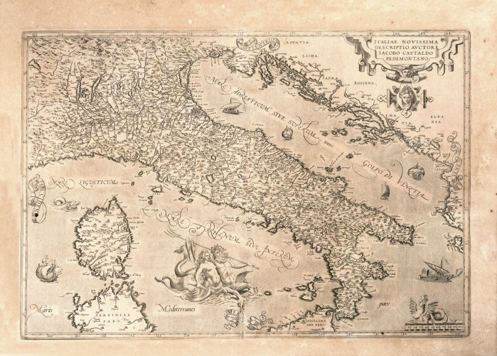 As cartographer to the Venetian Senate, Gastaldi had himself craft a map of “Italy” for the ducal palace in Venice, imitating the lost maps of Antonio de’ Leonardi of the peninsula’s situation in the Adriatic, which had won wide praise before their 1577 destruction as “una tavola d’Italia così perfetta nelle sue misure” that copies of the painted map were avidly commissioned by “diversi Principi.”  The printed peninsular map that long bore his name, in varying orthographic forms, was expanded and refined by numerous engravers in the peninsula, including in Rome.  The map that was often reprinted from original plates in different cities was always associated with the Venetian cartographer, no doubt as a sign of his authority, and collated a complex hydrographic network in the peninsula but also, from the 1561 map, delineated its regional jurisdictional divisions.