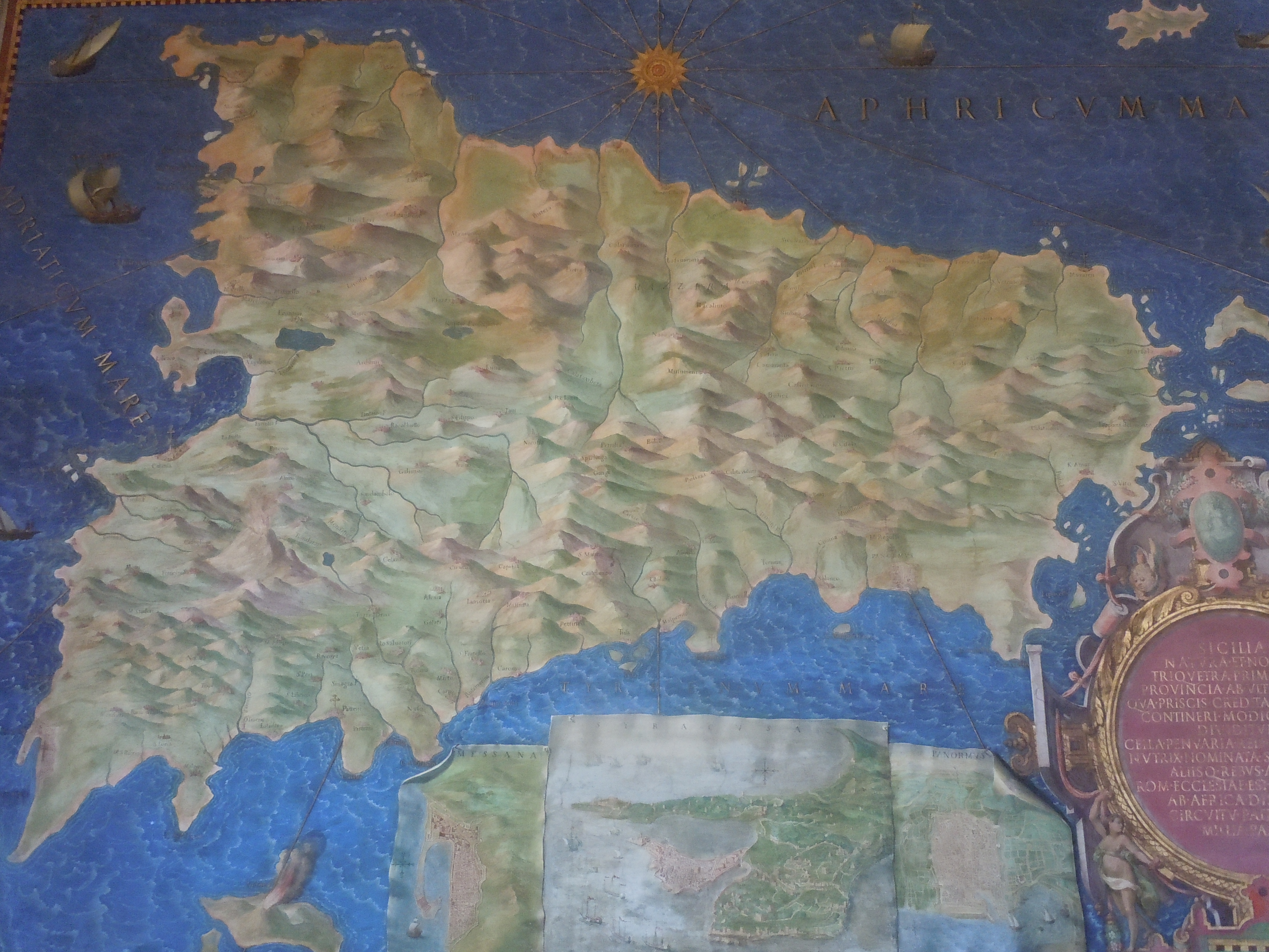 But, unlike the Gastaldi map, Sicily was in fact mapped in full detail within the following sequence of regional maps that line the walls of the Gallery, displaying its topographic variety with a considerable wealth of pictorial detail unable to be captured in an engraving: