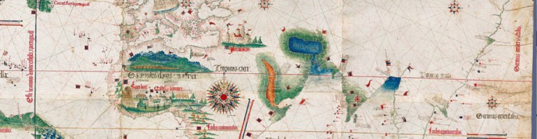 The Cantino map hence played with the protocols of charting. Rather than insist on uniform coloration of the ocean, to prevent obscuring rhumb lines, but to maintain its elegance, as the cartographer colored certain regions a light green, by confining the blue paint to the Mediterranean, Baltic, and unbounded Caspian sea, the map combined a pictorial artifice with the practice of charting or representing oceanic space–the Mediterranean had its own portolan chart, and perhaps didn’t demand that its expanse be represented in a similar style. The combination of artifice and nautical protocols exemplifies the huge expansion of the purview, as well as containing the first news of the Brazil in Italy, which was soon diffused in other charts and maps.