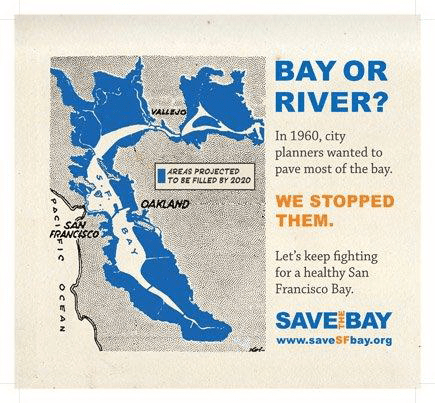 The suasive force of the map marked a victory of self-determination for most residents–enlisting interested citizens, fearful of the map that the future showed, led three women to invite for coffee the directors of the Save the Redwoods League, Audubon Society, and Sierra Club, to describe the possibility of reversing the steady drip of garbage, sewage, and growing shoreline stench that must have encouraged the logic of extending landfill to an area where garbage was regularly dumped and set on fire, at night, fell on deaf ears, only with the growth of the Free Speech Movement, and as 90% of Bay wetlands were lost and the Bay already reduced by a third due to dumping garbage and land reclamation, the appearance of the map, “Bay or River?,” electrified resistance to redevelopment projects, and the creation of the Save San Francisco Bay Association.