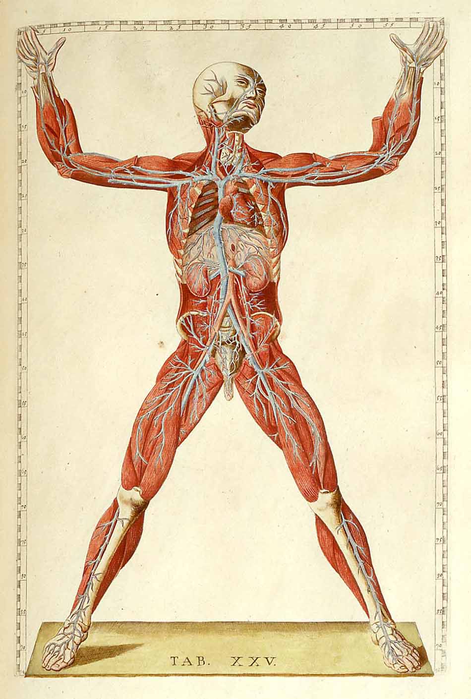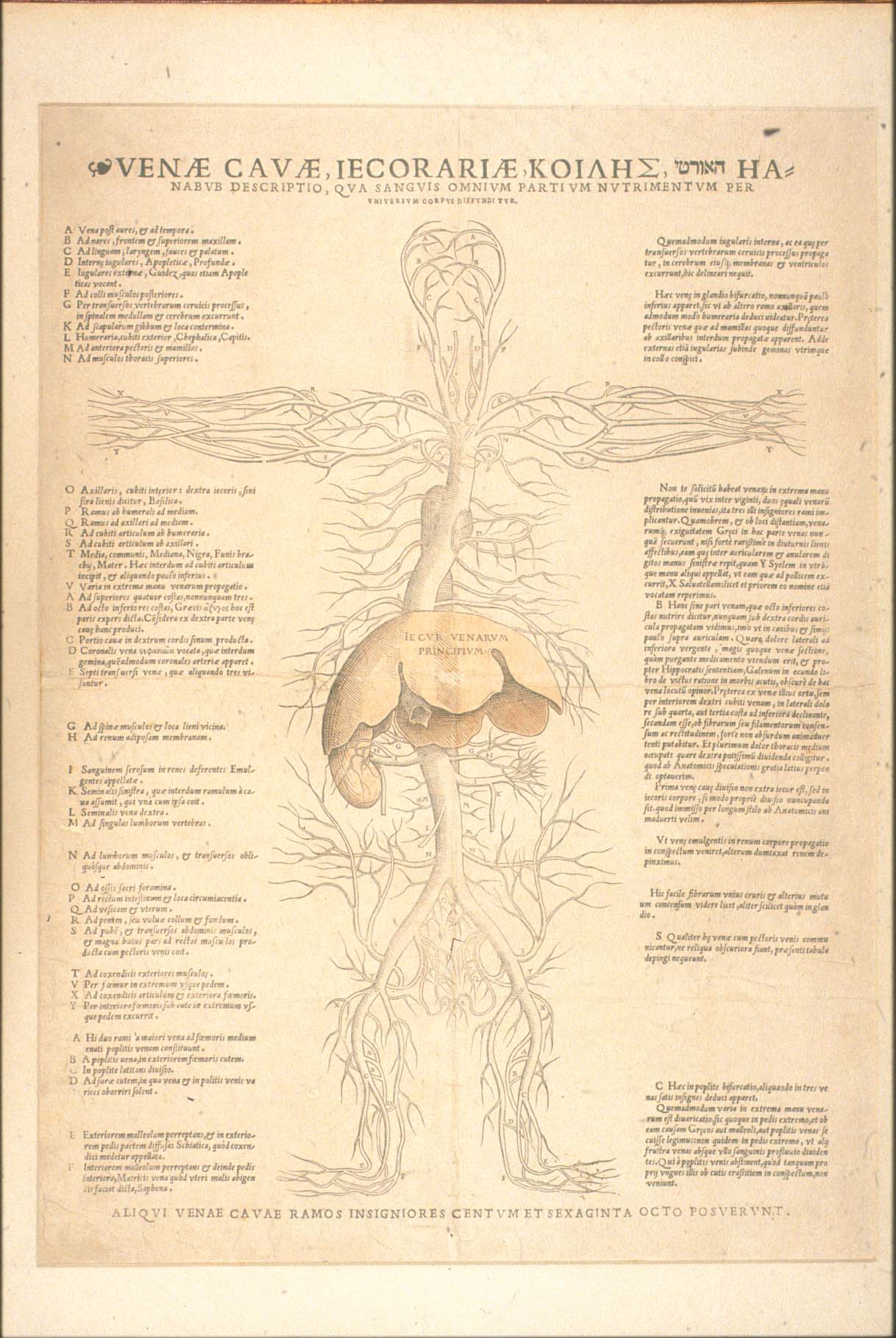 The “Evelyn tables” echoed the anatomical prints, also made for students in Padua for consultation by students who attended public dissections.  Before techniques of wax-injection, these images not only provided an invaluable pedagogic device to “view” the body’s interior; the metaphor of the map also provided a ready model of readability for an image of the body.  The surgeon William Cowper, to whom Evelyn boasted of having obtained the planks, later designed engraved images after their disposition of veins to teach his students, reflecting the huge interest Evelyn had for an image he believed totally foreign to England.  They how it recalls the skill with which the anatomist Andreas Vesalius had crafted detailed a large detailed image the body’s veins engraved by an artist, Stephan von Calcar, in Padua in 1537-8, in an often-reprinted image that foregrounds the centrality of the vena cava–and whose position was  relevant in debates on sites of bleeding to relieve pain in the side of the body, and as a guide to understand the benefits of bleeding at the inner elbow, forearm, or below the knee.  The vena cava leading to the liver assumes a centrality in this image, more reminiscent of a caricature than an objective illustration or a map, but which focusses attention on its course: