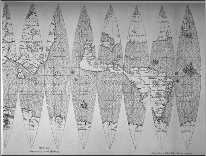 The following gores made after the 1530 globe reveal the precision of delineating coastlines of  islands and continents to meet considerable expectations for detailed topical cartographical detail:
