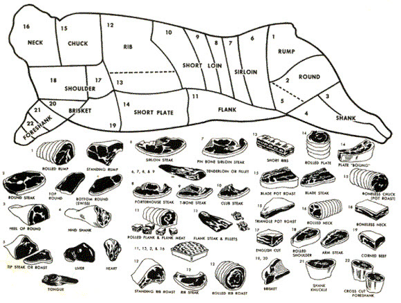 But the decorum for separating cuts of meat or meat apportionment has a long if submerged history, and reveals a cultural form of mapping, and the artifice of mapping accurately.  I begin with such a polite and decorous image since I’m moving toward some diagrams of sectioning prime cuts that focus on the separation of cattle into meat cuts–maps that similarly separate the division of animals’  bodies by butchers and convert what was a body into portions of edible meat.  Although Nicola poetically described on “Edible Geography” “the sculptural discovery of secret shapes within the familiar architecture of an animal,” mapping the carcass is not only a process of unpacking, or of revealing, but a transcription as well as a form of translation of the body of the animal to the provision of cuts of meat–a renaming of body parts as forms of meat.  The transcription converts embodied form to table, dismembering the body by preparing of the cow’s carcass into pieces of prime cuts for the eyes of the chef.  The process of extracting individual cuts of meat from the body, and renaming them, is the ultimate denaturalization, or repackaging of meat cuts for the market place–as its unwanted head, horns, ears, and hooves are discarded and not destined for consumption.  And although the map suggests proximity to the steer, few folks who read the image would have first-hand relations to the carcass, but rather a naming of regular configurations once seen in the butcher shop.