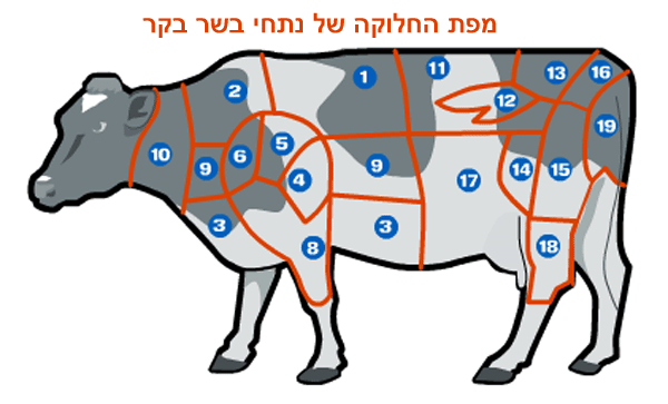 Yet the work of translation in such diagrams follows a distinct set of practices–or so goes the hypothesis of this post–as the steer’s body and musculature meets distinct markets for meat cuts, in ways mediated by technologies of dividing as well as the art of butchery.  At one extreme, the very different division of cattle carcass best known is perhaps that mandated by Kosher laws of food preparation through expert division by which animal slaughterers prepare the meat suggest not only follow bodily sectors–despite the limitation of edible meat to the front quarters.  As much as a distinct form of meat-preparation, the sanctioned division of the steer seems to reflect a degree politesse in its avoidance of the rear quarters of the animal, as well as meat use–refusing to acknowledge the flank, rump, or sirloin cut, and sanctioning only the central cavity up to the thirteenth rib, or often stopping at the twelfth.  (In Israel, the rear leg is considered kasher, and trained slaughterers take the time to remove the sciatic nerve, leading butchers to sell meat from the leg as kosher meat and maximize the amount of meat available–even as they disdain and discard the “non-kosher” nether-quarters of the animal and its head: