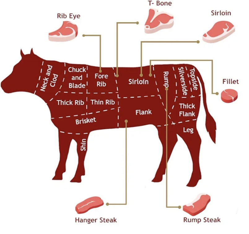 There seems to be far less of a lexicon for differentiating meat cuts, as they are increasingly denatured from the animal or steer, and familiar only as varieties of steaks:
