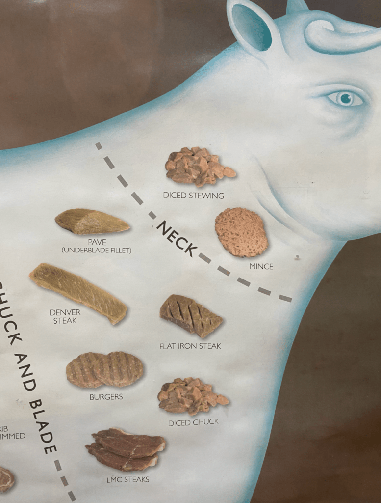 This process of translation, and of unpacking distinct cuts, is familiar already in the below enumeration of prime cuts, respecting a basic division of chuck, rib, loin round, and brisket, plate, flank and shank, and hinting at the deeper cultural division of mapping styles, even if the act of butchering has been separated from the meat shop: