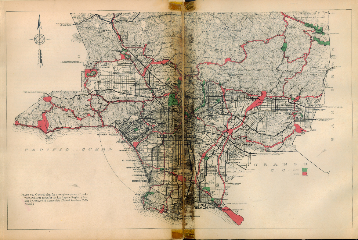 Davis showed how the rise of apocalypses that engulfed LA paralleled a deep historical denial of the ecological destruction perpetuated by the encasing of rivers in concrete and destruction of open spaces revealed in the 1930 Olmsted-Bartholomew Report, “Parks, Playgrounds and Beaches.”  This report, which detailed the effects of rampant urban expansion–and in the 1990s became an icon and emblem for the destruction of LA’s natural environment, and a “lost Eden” irrigated by riverine paths was transformed into a transformation of the Los Angeles river into a freeway–had the odd distinction of being suppressed by the very Chamber of Commerce that had commissioned it to be drawn, so clearly did it represent an image of the city that they city did not want to encourage.