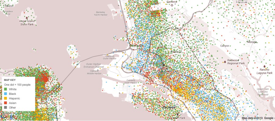 Published July 4, 2013 in Oakland Represented Variously: What We See When We Map Oakland’s Inhabitants | Full size is 1078 × 476 pixels