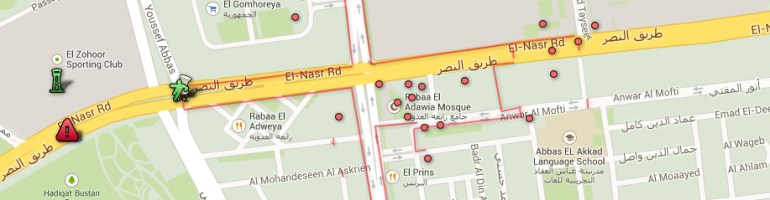 There was an initial attempt to map the “Morsi Sit-In” on the Al Jazeera network, as if to reaffirm its size. But the template of Google Maps can hardly come to terms with the mini-city created by the organization of entrances and check-points around the mosque, let alone the violent nature of the eradication of protestors–steamrolling the place, dispersing protestors by fire and tear gas canisters, and violating the site of the mosque. The occupation grew around the traffic hub of El-Nasr road, around the hub or nerve-site of the mosque itself, that convey its breadth and “infrastructure” as a movement. The map’s red dots of settlements are densest around the mosque, and define the ring around the neighborhood that had been surrounded with entry points before the order was given for army soldiers and police to move in, firing tear gas canisters to disperse the crowd and advancing into the square, where fires burned as police reportedly arrested more Muslim Brotherhood leaders as well as protesters who occupied the square, and entered the mosque itself: encampments burnt, the barricades surrounding the mosque destroyed, officers fired live ammunition as well as rubber bullets on retreating demonstrators, and protestors burnt tires around the last space the Islamic Brotherhood held in Cairo.