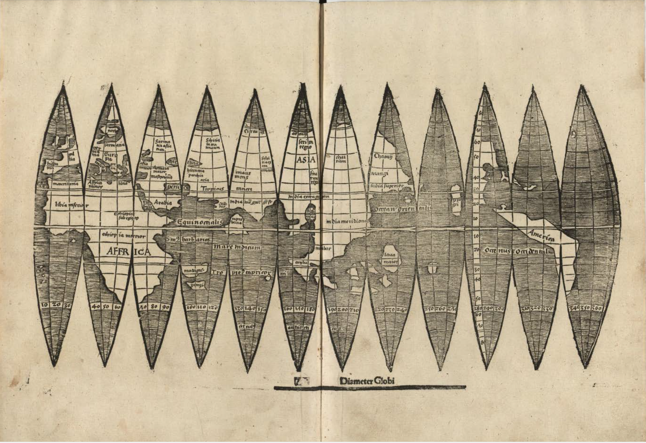 This set of gores, only discovered bound between two other volumes in the holdings of the University of Munich, suggests that it met a growing demand for the assembly of globes that included the most recent information of nautical charts. The gores were made to be readily affixed to spheres of similar diameter to the eggshell globe–the line distinguishing the “Diameter Globi” reminds us of the material use that this flysheet met, and the flexibility of the medium of a globe in displaying spatial information, and is unlike the four other sheets of gores Waldseemüller designed which are known to have survived. The creation of gores to map the world suggested the popularity and currency of creating a comprehensive global map, however, even in an age of terrestrial projections: if we valorize the Ptolemaic precepts that the ancient astronomer set forth for transferring the curvature of the earth’s inhabited surface to a plane, whose indices guarantee the preservation of uniform scale, distance, and spatial orientation, the embodiment of that space as a globe was as much of a concern for early modern map-users: the “gores” designed by Martin Waldseemüller provide clear evidence, if they rarely survive, of the demand for making such “self-made globes” in the early modern period to visualize terrestrial expanse.