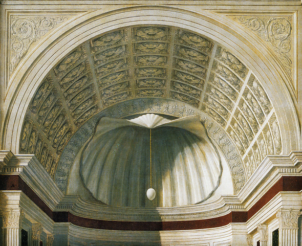 The globe is a miniature, but the size or ostrich eggs were valued as sites of wonder in ecclesiastic settings–ostrich eggs were described as hung in church as mirabilia by Girolamo Cardano, the naturalist Conrad Gesner, and Sebastian Münster, as in this detail from the altarpiece by Piero della Francesca known as the Brera Palla–and were treasured as items gilded in silver, as both natural wonders and curiosities.