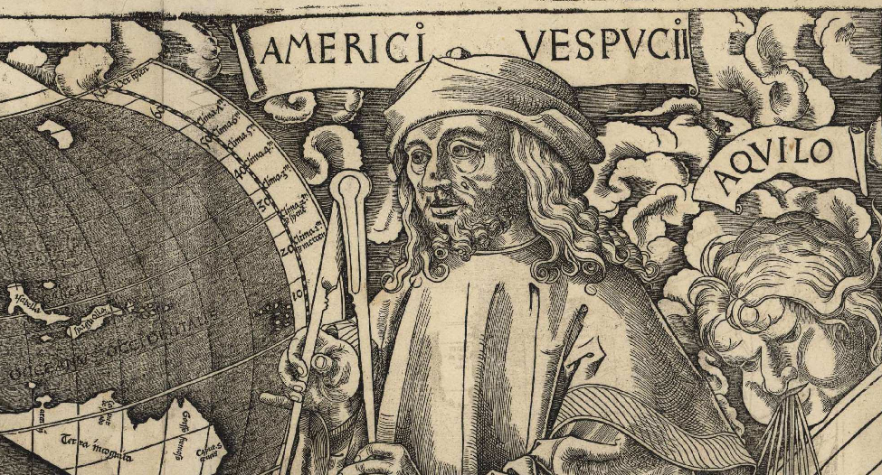 Waldseemüller’s multi-sheet wall-map of four by six feet assigns a heroic role of the cosmographer as a robed and world-weary scholar, with his head is situated among those of the winds, who creates the map with compass in hand, here identified as the academically robed mapmaker Vespucci–whose findings provided the basis for the new world map–