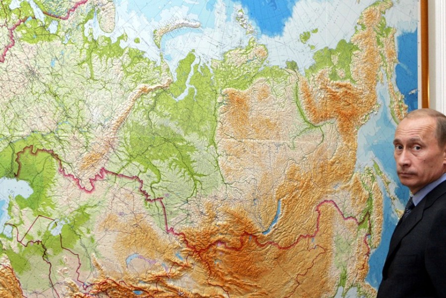 Russian President Vladimir Putin stands in front of the map of Russia and Commonwealth of Independent States between working meetings at his residence Novo-Ogaryovo just outside Moscow, August 11, 2006. REUTERS/ITAR-TASS/PRESIDENTIAL PRESS SERVICE (RUSSIA) – RTR1GAL7