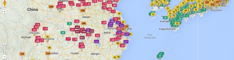 In the south of China, from Chengu to Hubei to Anhui provinces, one can trace a stream of red flags along rivers, and multiple regions of unhealthy air quality deep in the interior: