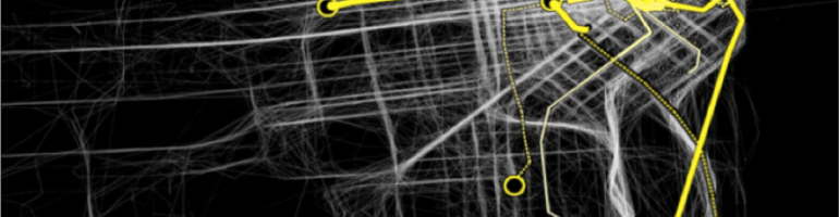 The image Snibbe and Rodenbeck designed offered a memorable real-time contours for a city’s urban space that show a far less dispersive wandering around the vagaries of urban byways, and a focussed repetition of routes around a relatively restricted urban grid.  In each of its successive animated time-lapse iterations and real-time rehearsals, the Stamen’s “Cabspotting” re-mapped urban space by tracking the collective aggregate of motion across urban space, using data from embedded GPS data of position, speed and acceleration to remap a strikingly plastic living urban landscape in dynamic–if haunting–ways:  pay-per-fare riders sculpt streams of traffic across its major streets and thoroughfares, rife with cab rides, appear illuminated by the aggregated overlay of rides over time, showing the different rides of the city that were being performed as if to condense a residue of the collective transit through the city around select hubs and thoroughfares of increasing or diminishing traffic.