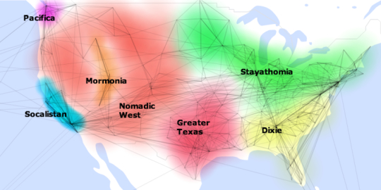 This is by no means the only means recently advocated or devised to divide the country. Creative parsing of the country into regions that the demographic of Facebook users seems to map into clusters of “Friendship” might be an alternative division of constituencies, if you posit the idea that regions should possess some inherent coherence or identity, measured that they be more likely to be Facebook “friends”–as if that could create consensus, or that it takes too much time to arrive at consensus by political debate, which in themselves map interestingly onto Woodward’s creative divides.