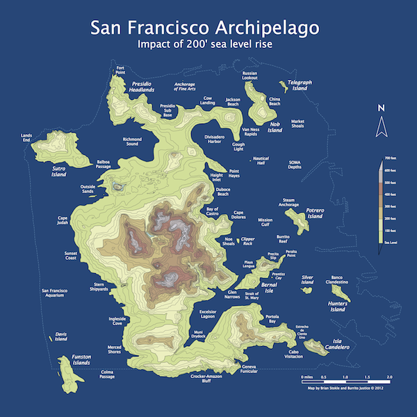 It’s a good way of forgetting the ways that we are bound to the allocation of resources, and to imagine that by going back to the drawing board with the idea that it can be a tabula rasa, we might be able to better sculpt the future out of the confused state of the present, and find clarification in letting us forget where we are by remapping out sense of the present lay of the land or our responsibility to it–rather than removing us from the land. And of the future of the state, evident in the selection of a new topographic map, from a futurist press release dated 2072, imagining the new shoreline created due to erosion and the disintegration of the arctic ice cap, created by Burrito Justice, of the remade San Francisco archipelago: