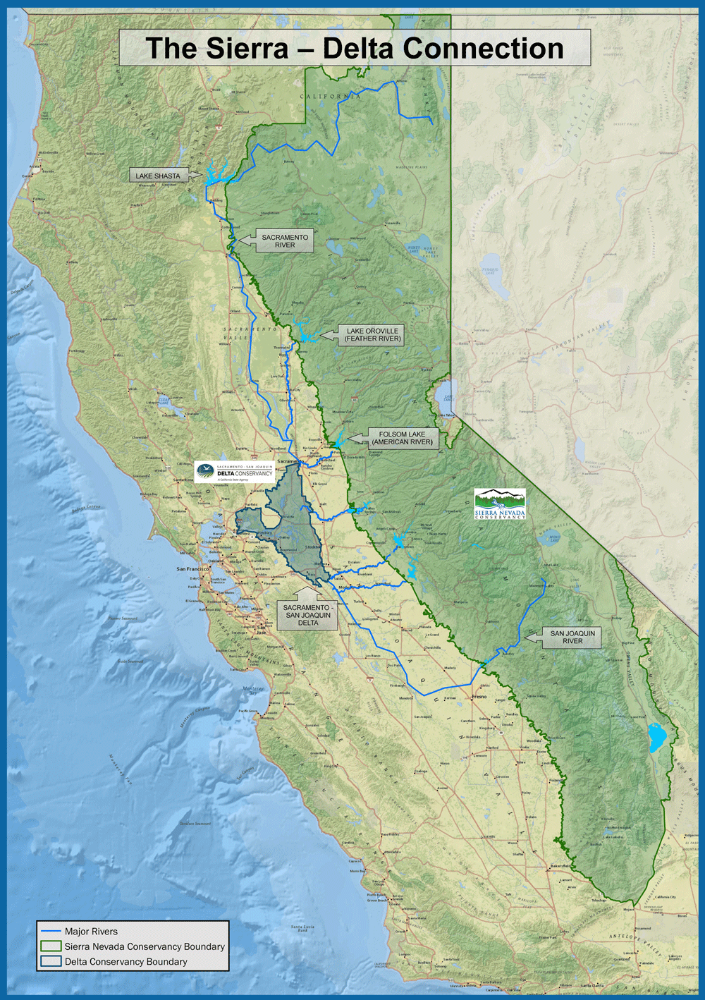 Indeed, not only do the Sierras provide over half of the total flow into the Sacramento Delta–the lynchpin of the complex system of irrigation and aqueducts that provides water to 25 million Californians and some three million acres of actively and intensively farmed agricultural land, and create a water structure that provides clean water to the state, but the linked ecosystems of the Delta and Sierras demand an increasingly collaborative policies and oversight that the very idea of division seems particularly shortsighted and would not only blindside the state but obfuscate issues.