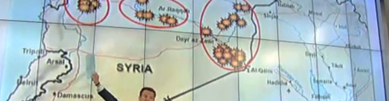 The Khorasan Group have yet to make themselves known or confirm their very own existence.  Rear Admiral Kirby described how the attack had disrupted “imminent attack plotting against the United States and Western interests” from the very  “training camps” and “bomb-making facilities,” destroying a “safe haven” they secured in Syria to develop the very sort of external attacks with which ISIS has not been identified and had even distanced its principal goals.  But the existence of “bomb-making facilities,” almost designed to trigger fears in the American public, keying in as they do to a narrative of terrorist attacks against the Homeland, provided a rationale for extending the airstrikes campaign into Syrian territory in order to eliminate the threat that the Khorasan Group posed.  The dangers that were posed by the group against whom the attacks had been directed, according to US Central Command, justified expanding the war that intended to “degrade” ISIS to a broader fight to protect national interests.  The situation maps Kirby showed also mask both the failure to seek broader Congressional authorization for the strikes and the potentially disastrous long-term consequences of continuing such attacks and targeting  sites that involved untold civilian casualties.  Although the map did their best to isolate the targets for these strikes, they illustrated both the pronounced geographic and cultural remove of Department of Defense decision-making, as well as the costs of staging these attacks from aircraft carriers in the Red Sea or Persian Gulf.