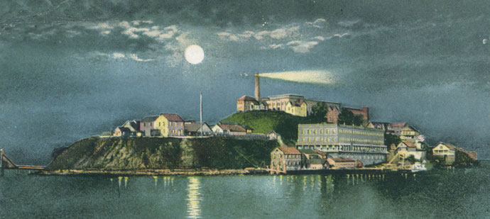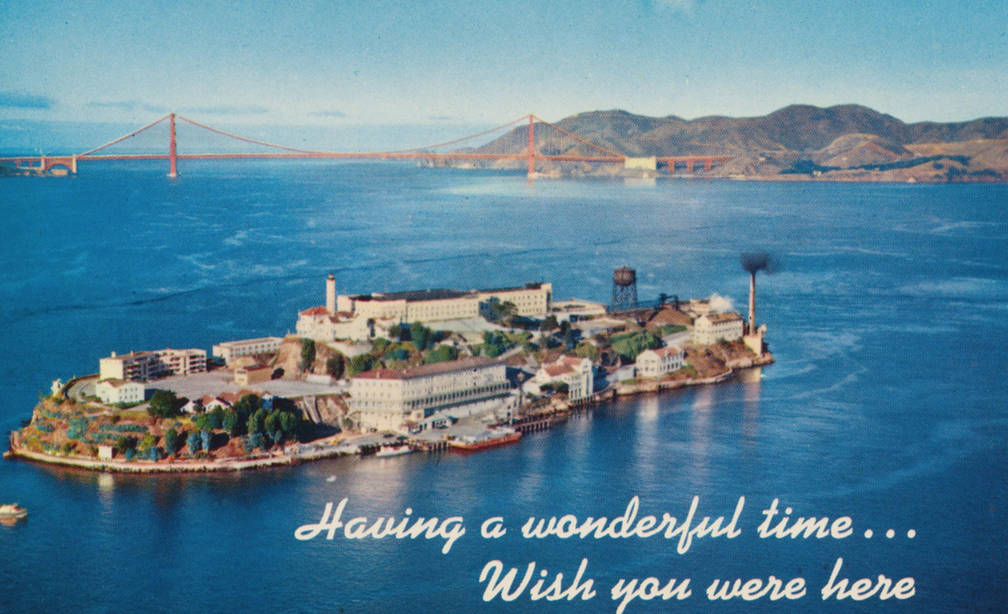 After the end of an era with closure of the prison in 1963, the complex became a tourist site that was a butt of jokes–“Having a Wonderful Time/Wish You Were Here!”–reflecting the unease with which it was known both among criminals and in popular jargon as “the Rock” as a space of isolation, whose remove in the Bay Area, surrounded by deep waters, made it an object of fascination more as a site of planning impossible escapes.  Its twelve acres incarnated an image of a penal colony in the United States.