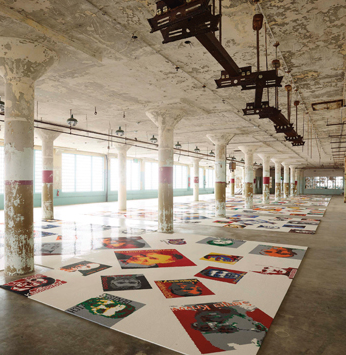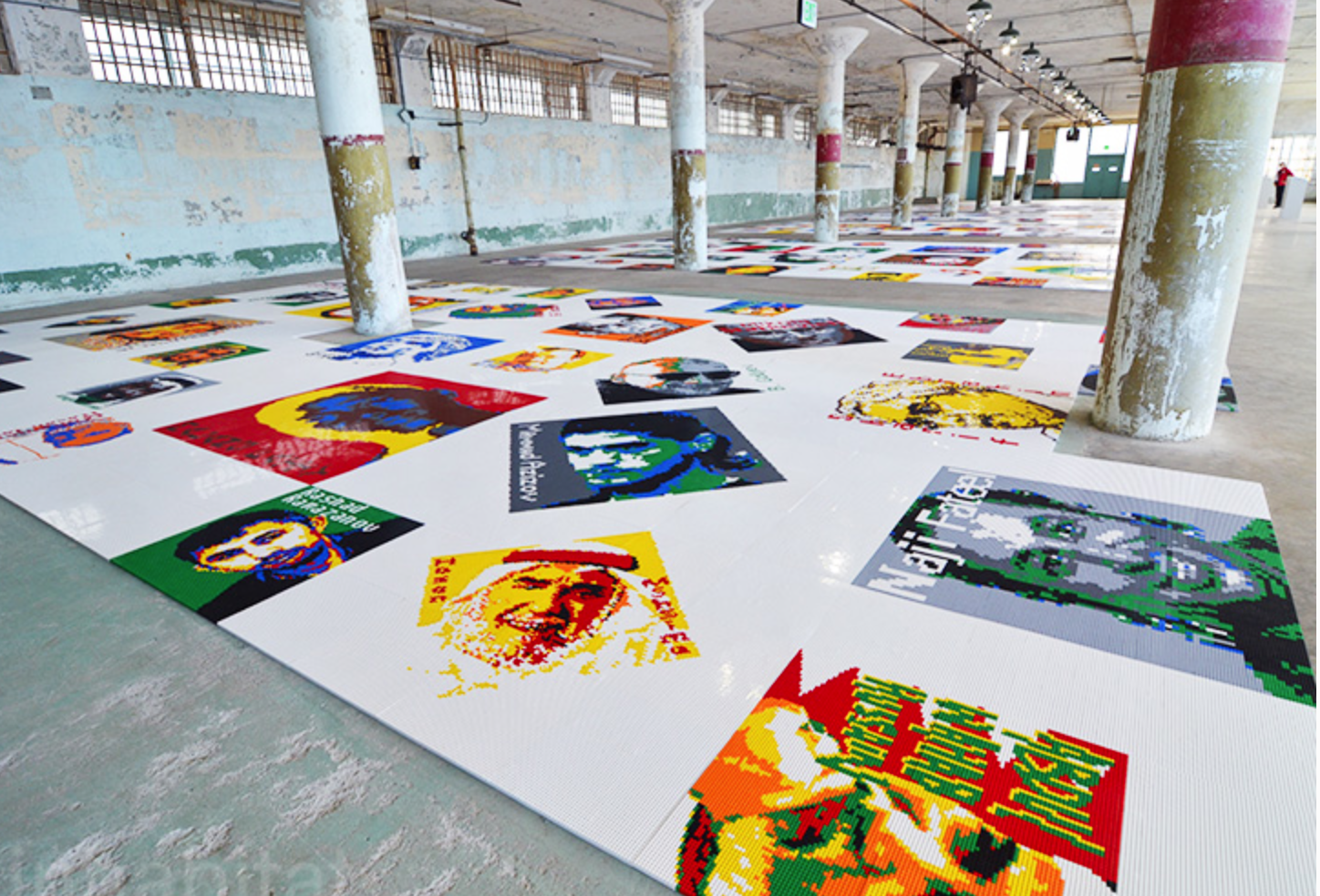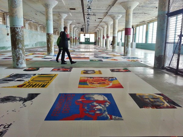 The colored pavement of pixellated portraits of one hundred and seventy six recent prisoners of conscience map global imprisonment in a one-brick layer of Lego runs across the grey floor of a cavernous room of the abandoned New Industries Building in the former high-security federal prison.  The choice of a world-famous former prison such as Alcatraz, isolated on an island in San Francisco Bay, by the For Site foundation to locate these technicolor mug shots of detained champions of human rights is particularly apt site.  The temporary construction of 1.2 million Lego pieces serves as a canvas to commemorate the resistance of those charges or convicted of crimes in the complex of one hundred and seventy-six figures create an atlas of imprisonment–from familiar faces from the late Nelson Mandela (imprisoned in solitary South Africa from 1962 to 1989) to Aung San Suu Kyi (under house arrest house arrest in Myanmar for almost 15 of the 21 years from 1989 to 2010) to Liu Xian Bin to Liu Xiaobo (sentenced to eleven years of confinement in 2009) to Edward Snowden (forced to seek refuge in May, 3013 after leaking NSA documents) to the Iranian Shi’i cleric Sayed Hossein Kazemeyni Boroujerdi (imprisoned in October, 2006 in Teheran).  Set in the floor of an abandoned structure of forced detention and prison work, the bright mosaic of faces is eloquent in its muteness and sense of survival.