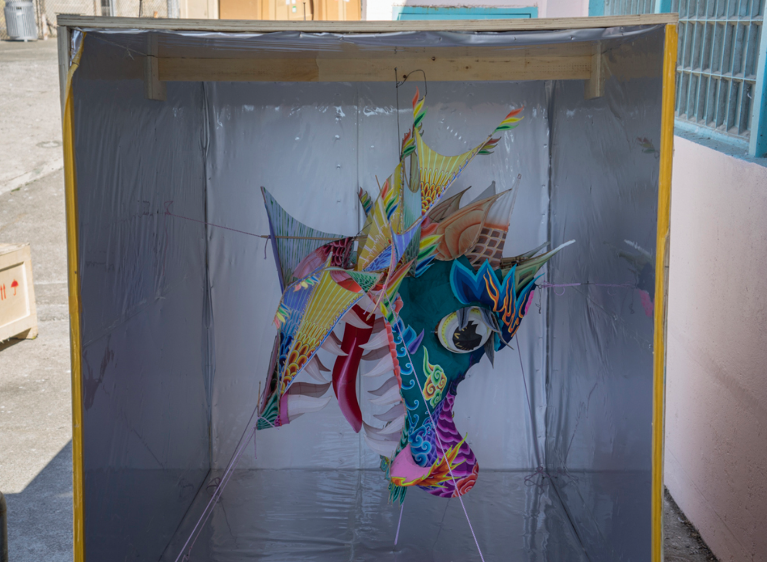 The liberating freedom of these kites that are positioned in “Wind” fill the air of the musty New Industries Building with a new spirit of liberation.  As much as being individual artifacts or craft-like constructions, the most eloquent contrast between the painted paper kites and the structures in which they are exhibited suggest the very space in which individual meets the structure of imprisonment, or the archipelago of incarceration, as the space of imprisonment into which the visitor is filled with pieces of craft that recall the open spaces that surround the island: