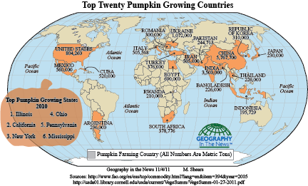 It is easy to forget trick-or-treating was ever closely tied to the agrarian calendar of harvest in an era of year-round fruits and vegetables.  And the pumpkin seems a Halloween icon of the New World.  But even with the omnipresence of SpiritHalloween stores that dot the nation, always advertised on billboards, it’s nice to remember regional differentiation of zones of pumpkin production–and variations of pumpkin cultivation on which we rely even in an era of industrial farming.  And even if turnips and rutabagas were a choice of Jack O’ Lanterns in Ireland, and other squash were used abroad, the pumpkin is an artifact of globalization, from Bosnia and Herzegovina to Japan to Australia to Hong Kong, we remain rooted in its growing regions.