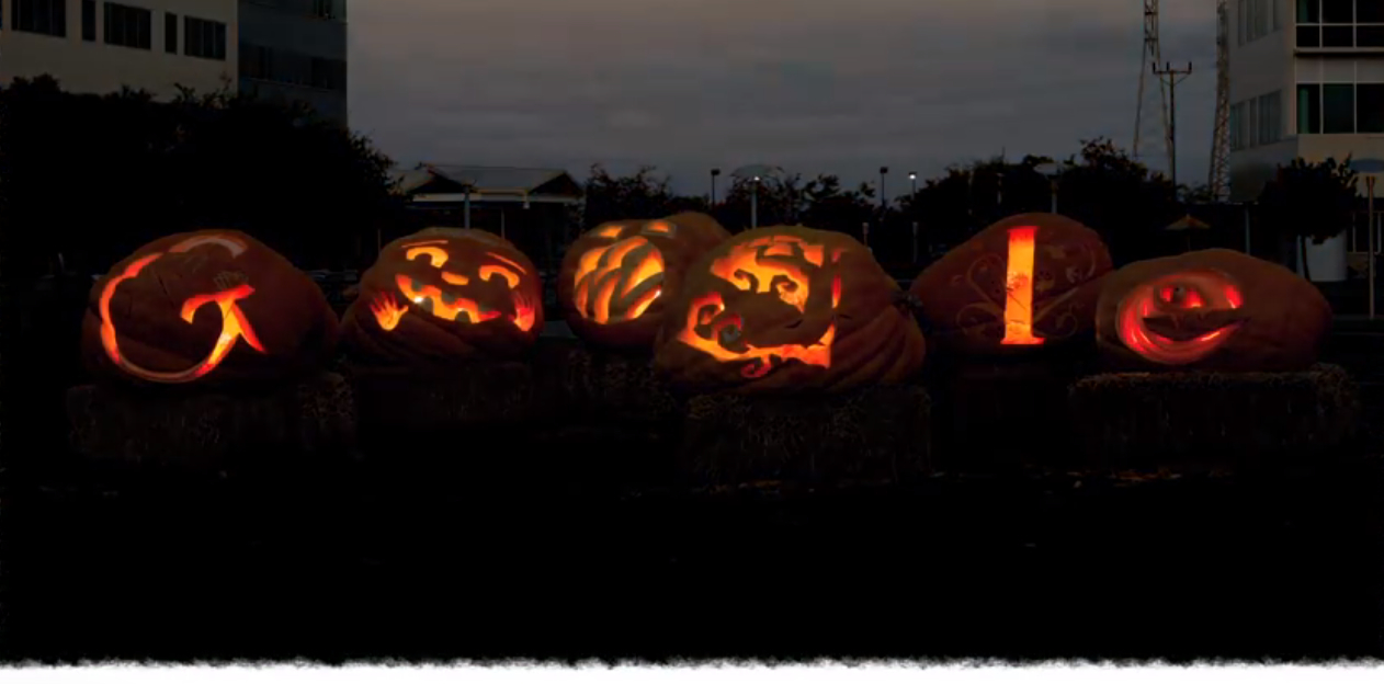 The currency of the carved pumpkin head made for a popular Google doodle.  But the image was not separated from the act of carving away those gourds in the smashing debut in the quick carving of those massive pumpkin heads outside Google HQ in 2011 Halloween Doodle, in something of a sly reference to the agrarian origins of the region, and its proximity to the pumpkin patches of Mountain View, Hollister, and Santa Cruz where so many Northern California pumpkins are grown:  for the very same time-lapse clip of carving pumpkins  rooted Halloween in the site-specific rite of pumpkin-carving before dusk, set to an antic soundtrack of preparing huge pumpkins for sunset.