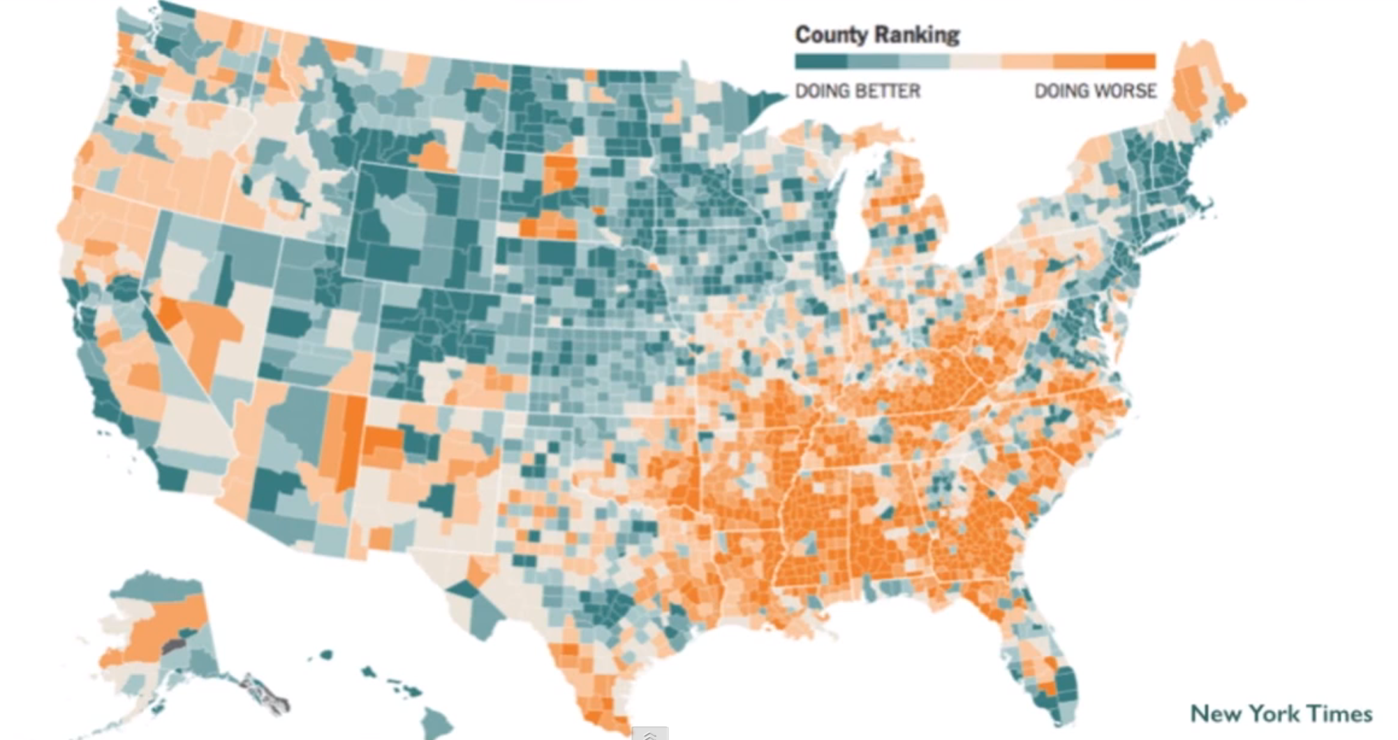 11. The way that data visualizations function as maps in the performance of statehood has been increasingly disrupted in a range of info-graphics. The disruptions such visualizations chart reveal the persistence of poverty across certain areas of the country–a poverty we far too often naturalize, or which is absent from the national maps that we draw and the divides that we emphasize within them. It’s striking that the very divide mapped in the header to this post–the Gasoline-Tax Divide–creates an eye-grabbing continuity across many of the same southern states that jumps out within the contemporary maps of the national distribution of well-being, a county-by-county assessment of QOL (an alternative to GDP, taking a sextet of life-expectancy, income, education, disability, obesity, and unemployment, rather than only a financial metric).