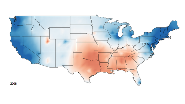 The attempt at creating an atlas of data visualizations, comparing different paper maps, would extend to a chronological ordering of the shifting spaces of political affiliations that the quadrennial recurrence of presidential elections would allow. The terrestrial geographic map of the United States white carries intense contiguous azures in select spots and a roughly rosy interior, David Sparks found, adopting a uniformity of colors to earlier political parties and mapping how political affiliations shifted over one hundred plus years since the Civil War–or roughly from the time of Gannett’s map. Sparks’ chronologically collapsed isarithmic map of continuous coloration suggests some continuities among voters from 1876 to 2008, if it contains multiple narratives in voting habits by predictable fuzziness in electoral allegiances for most of the country. But the condensation Sparks devised in a video and collective synthesis reveals a proclivity among states below the thirty-seventh parallel, rendered even fuzzier in the synoptic one-minute animated graphic crafted from multiple frames from 1920 to 2008, whose animated choropleth reveals clear preserves of one-party voting, almost as if regions were inhabited by the ghosts of earlier political preferences. And the replication of the latitudinal divide immediately strikes the viewer, despite its almost air-brushed quality: