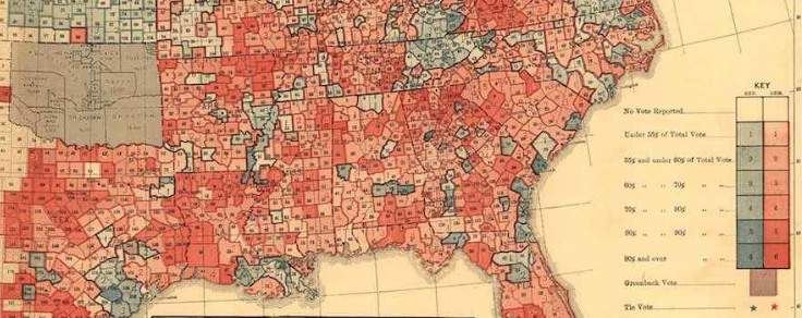 In ways that measure the collective memories of secessionist sentiments, the map seems an after-image of the survival of anti-Union sentiment, or at least rejection of the program of Reconstruction that Republicans supported, and saw as the logical outcome of the Civil War.  But while quelling the actuality of Southern Secession, The dichotomous distribution of contrasting shades coloring the continent in counties shaded by two alternate primary colors both recorded the transition to a shifting society after emancipation–when privilege remained restricted to whites, effectively, and the deep difficulties overcoming of division between north and south.