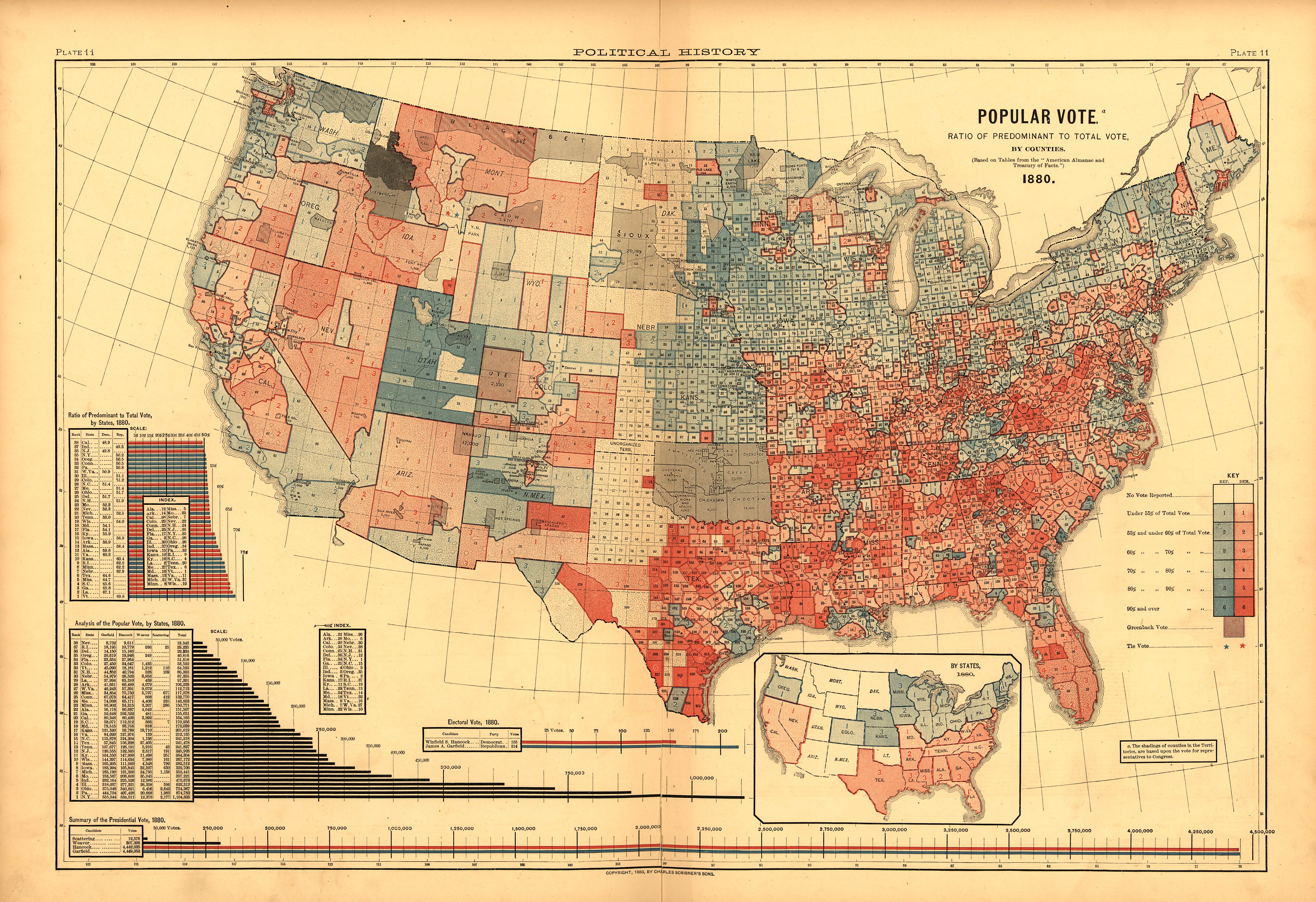 The image suggests the increased expectations of cartographical literacy to read and interpret, that seems to mask over the deep divide between North and South which would repeat the division of the Civil War itself:  the reader of the map would note with surprise the considerable number of electoral votes assigned Minnesota, Kansas and Nebraska, which serve as a counterweight to the greater electoral votes of Southern states, that uniform swath of red  encompassing a considerable share of nation’s geographical territory.   Hayes’ presidency rested on midwestern states as Ohio, Iowa, Nebraska, and Kansas but also masked a division in the country parsed in the first data-maps and demographic infographics:  the map is also startling since it reflects political divides from recent elections:  the color-scheme almost holds, irrespective of shifts in political affiliation over one hundred and twenty-five years.  The dextrous distribution of the popular vote Gannett mapped was reprinted in Scribner’s Statistical Atlas (1883), for viewers to scrutinize local variations in the distribution of election returns at fine grain on the county level.