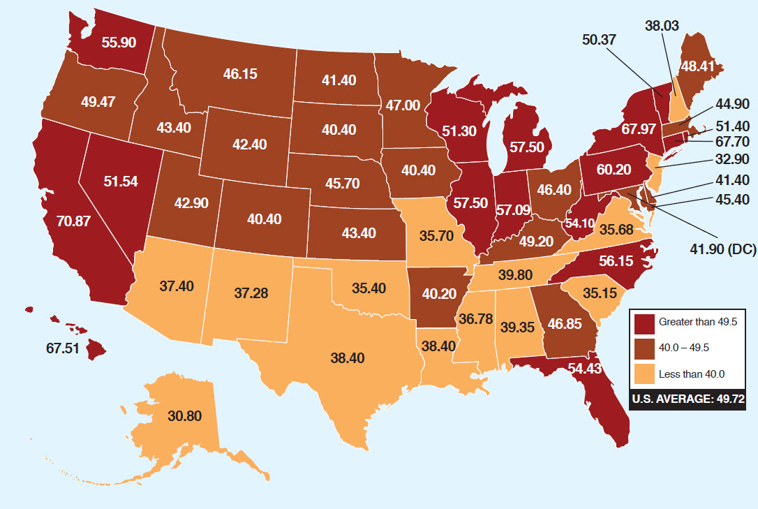 The embodiment of the United States that Gannett provided has long been with us, and has oddly continued to persist in some form–if with perhaps less clearly drawn and delimited lines, to be sure–to the continued image of a dichotomous divide within the Gas Tax Latitudinal Divide that has recently returned, ostensibly to trace the inequities of taxes that residents of different states are asked to bear–California first and foremost, but closely followed by New York, Connecticut, and Hawaii.