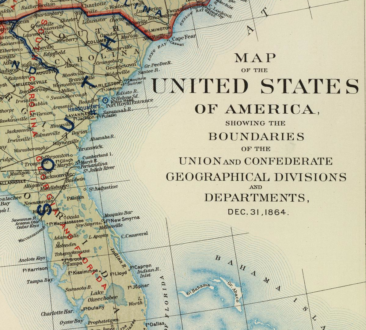 Map of America NortheastDetail of “Map of the United States of America showing the boundaries of the Union and Confederate geographical divisions and departments, Dec. 31, 1864.” (1891-1895) (Courtesy Rumsey Associates)