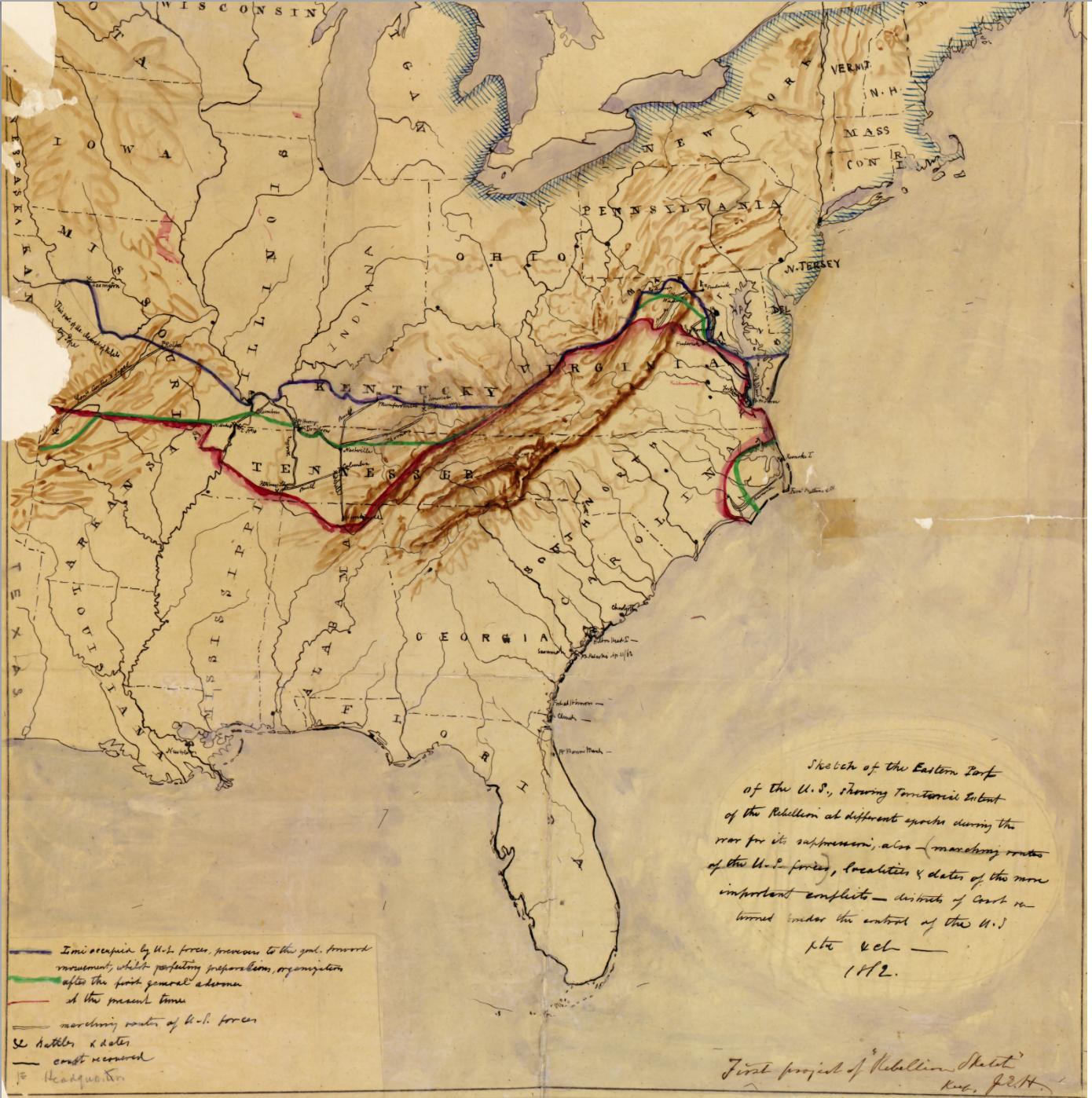 –though a manuscript map that figured secession, “showing territorial extent of the rebellion in different epochs during the war for its suppression” oscillated around the latitudinal divide, in ways that later maps of the popular vote would implicitly address or come to terms, even while they ostensibly map current events.