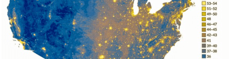The picture does not look good for the future of quiet spaces in most of the coterminous United States. The stars and streaks of aggressively bright sulfuric levels of smoky yellow–indicating concentrations in urban areas of a level of 51 decibels or more–maps clearly onto population concentrations from the shores of Lake Michigan to Dallas, Atlanta or central Florida. The noise map reveals huge differences in noise tolerance and indeed background noise that most Americans experience as normal, and indeed the auditory expectations most bring to their days, and the relative absence of silence over a large part of the inhabited country that noise has infiltrated, from a light gauze of yellow that surrounds are largest farming industries to the clusters of noise around expansive urban areas. In those deep blue swirling patches of the interior lie the most silent spots of the country,abysses of quiet which register the lowest absolute levels of sonic interference, far from the pollution of urban noise which seems to spread like age spots across much of the eastern half of the continent. (The very deepest deep blue regions designate areas of background noise below twenty decibels, the sound of a ticking watch, far below the a refrigerator hum, and very far from the ever-present ring of cell phones, piercing blasts of jack hammers or car alarms, freeway rumble or such sudden spikes as sawing concrete that now seem to so often mark the hubbub of urban life that is often difficult to blank out save by white noise machines.) A considerable share of the population must be quite habituated to an almost constant loudness of almost fifty dB, or about that of constant traffic–and just below that which is claimed to increase high blood pressure, tension, and heart attack risks.
