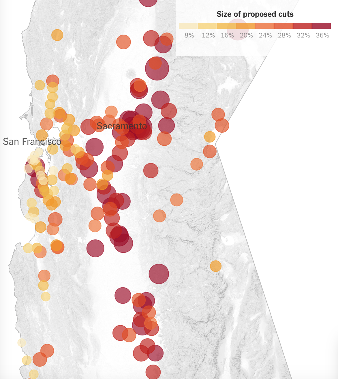 Almost as powerful a portmanteau as “Mansplaining,” the compound currently trending on Twitter presents both a righteous form of indignation, improvising map via social media that suggests our changing sense of our environment may open new arenas of public speech. The creation of a set of zoomable interactive maps from the New York Times of projected water-cuts and current water-usage across the state’s water districts have been recently mapped an uneven balance between water districts statewide, in ways that not only call clear attention to sharp discrepancies of water-usage across the state, not only between how urban and agricultural regions might be affected by mandated reductions in public water usage–