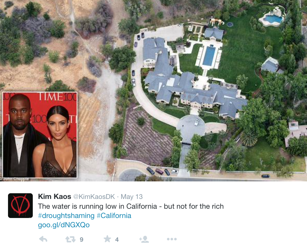 Will the hashtag #droughtshaming change the public water consumption levels in California? or is it only a manifestation of an all too long-submerged consciousness of evident property differences across most of Southern California–a space where ever-conspicuous consumption has long been made manifest in keeping yard lawns perpetually green? and what of the Wet Prince of Bel Air, who has used an incredible 11.8 million gallons yearly during the drought to maintain the green yards on their southern California estate?