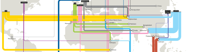 But the selective nature of support seems particularly striking–with, as of 2013, the UK tied to Pakistan, Ethiopia and Bangladesh, the US to Kenya, Gaza and the West Bank, and Afghanistan, Australia to its neighbors Indonesia, Papua New Guinea, and the Solomon Islands, Norway to Brazil, and France to Myanmar and Morocco. The routes for disbursing foreign aid are hardly a process of global circulation, but provide something like a strategy for promoting the possible circulation of global funds.