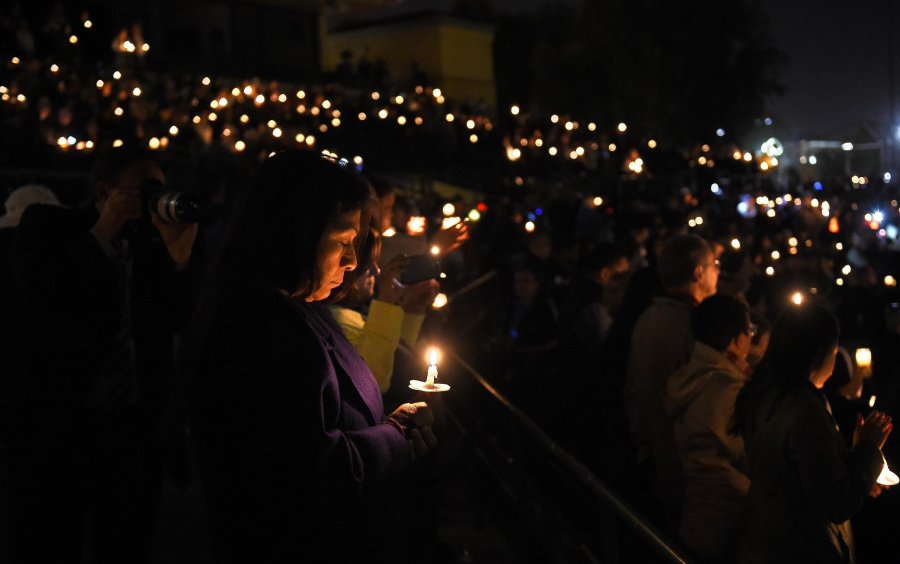 People hold candles during a vigil for shooting victims on Thursday, Dec. 3, 2015, at San Manuel Stadium in San Bernardino, Calif. A husband and wife opened fire on a holiday banquet, killing multiple people on Wednesday. Hours later, the couple died in a shootout with police. (AP Photo/Mark J. Terrill)