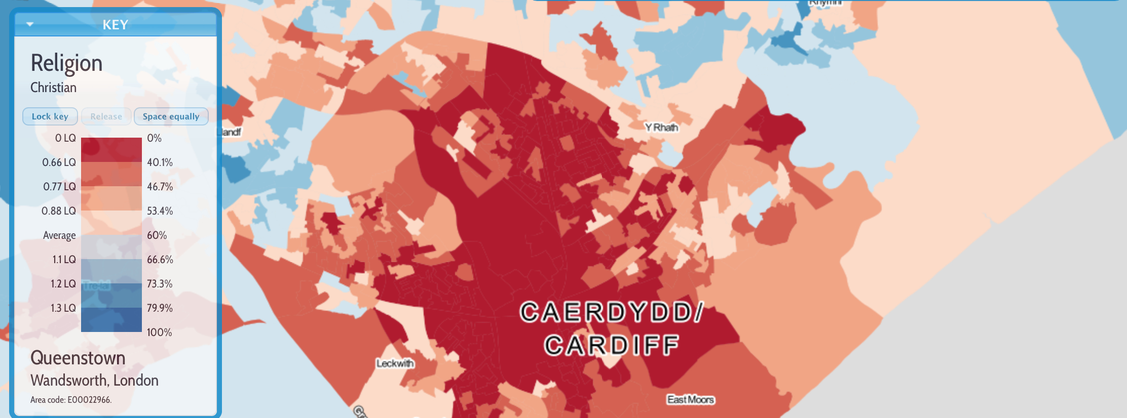 Of course, confession is less–for now–of a topic of civil dispute in western societies, although recent events have suggested this might not always be the case and such information would be far more privileged in, say, Syria or Iraq.  But we can easily access the block-by-block distribution of how the faithful or agnostics declare their affiliation in Britain, zooming into specific regions that seem potentially terrifying when viewed through the eyes of potential antagonists, even despite the lack of identifying individuals who declared their attitudes to religious belonging.  To take a randomized example, for example and for points of comparison, one can look at a smaller city in England, as Cardiff, in Whales, to map relative concentrations of those reporting their religious affiliation as belonging to the Christian faith, albeit without a quantification of degrees of conviction or of the spatial spread of practices of church-going: