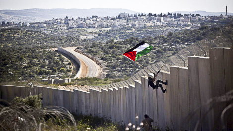 A Palestinian youth places a flag on the Israeli wall during a protest marking 9 years for the struggle against the wall in the West Bank village of Bilin, February 28, 2014.</p>