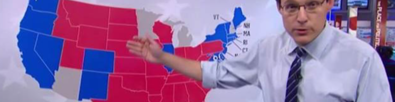 –although these stark divisions in the distribution of voting patterns disappear in the district-by-district electoral votes map posted by Mark E. J. Newman in clearly contrasting stretches of red and isolated islands of blue with only the occasional all-blue state.