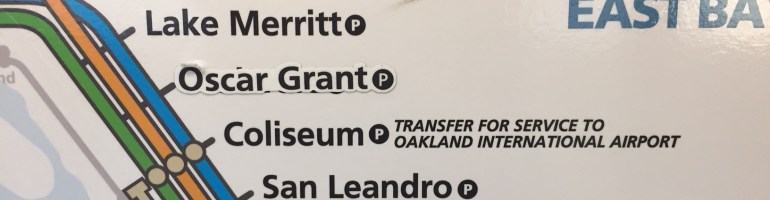 The placement of the new place-name performed a compelling counter-cartography that suggested resistance to the dynamics of power in the city.  Oscar Grant’s tragic death had been part of the Oakland landscape for some time, to be sure.  It was long attempted to claim public recognition in a place name, and the appearance in BART font of the late man’s name on the map BART users consulted reminded one of the fractured social economy of the city, and the uneven legal access or accountability that Grant’s death had been emblematic back in 2009, and inspired Ryan Coogler’s award-winning first movie of 2013, which gave particularly poignant drama to the needless slaying of a man trying to live gainfully, and to provide for his daughter, who was shot with bullets as he moved after being stopped by BART police who arrived in response to an episode of violence in which Grant, by all accounts, wasn’t involved.  (Although the officer alleged he mistook his gun for a taser, firing into the prone Grant’s back as he pleaded to the armed police, praying he not be killed, as was captured on live video feed by bystanders’ cellular phones.  The shocking video shows the white BART officer reach for his .44 with puzzlingly calm intent that only helped inflame passions, charges of racism, and interrogation as it was captured on camera.  Films on bystanders’s phones raised sudden questions  of how such open and wanton use of force could have been, as some claimed, accidental.  Indeed, the footage made the BART station the location something of a primal scene of the recurrent racial violence under the guise of the law that haunts Oakland’s present as it haunted its past.