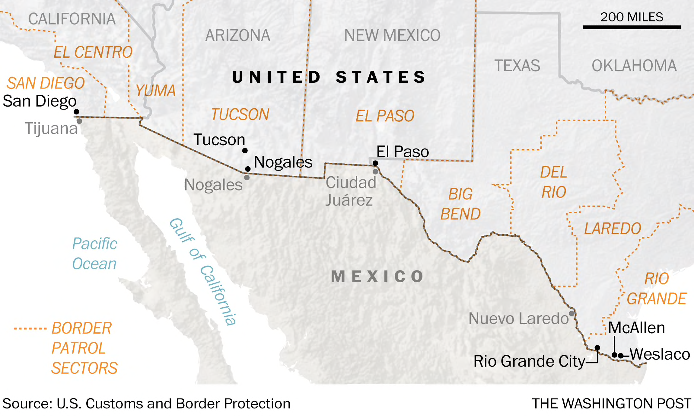 By focussing on the border–here shown, in a deeply misleading data overlay, as if the borders of immigration sectors of Border Patrol were distinct from the “wild” terrain view of Mexican states–