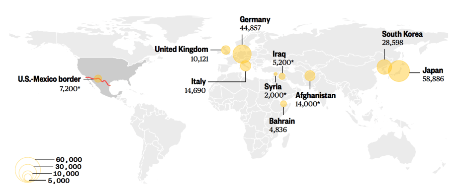 United States Troop Deployments on US-Mexico Border (expected) and in Afghanistan, Syria and Iraq on October 31, 2018; other numbers from June 30