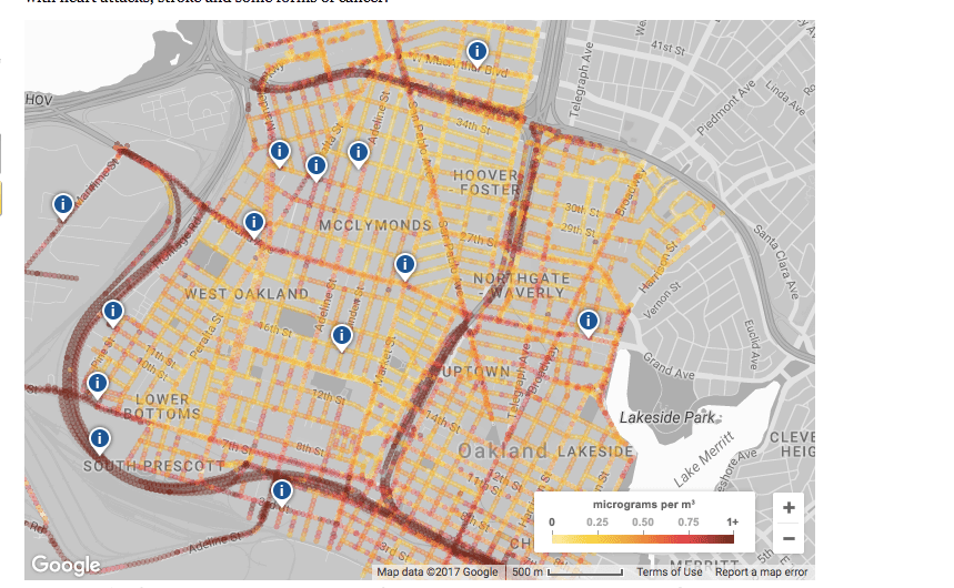 Toxic Releases into Air Near Long Beach/2014 (CARTInstead of constituting a record of anthropogenic change, the map focuses on a snapshot of the imprint of buildings on the soil, more than the impact of humans in or on nature, or of any sense of flux in the continued effects of emissions, release of contaminants, and their possible pollution of ocean waters, or combination with water vapors to create acid rain.  The intuitive sense of reassuring tangibility in the comprehensive record of every building in the United States reassuringly mimics the material world, and reifies it as a given structure, standing apart from its environment, or a lived world. While I lived in Oakland, the image of the East Bay was sharply unlike the registration of breathable particulate matter, generated and released by diesel exhaust courisng across the industrial area from the automative arteries of the 580 and 880, created by Google with the Environmental Defense Fund(EDF) and Aclima, a sensor technology provider, to map airborne pollution in West Oakland across highly trafficked corridors and West Oakland’s streets, mapping the density of the diffusion of particulate matter: rather than using only one sensor to monitor air quality–how did the idea of a fixed air monitoring station that was located at West Grand and Poplar emerge?–cars equipped with sensors drove four hundred miles to unpack what West Oakland Enviornmental Project’s Brian Beveridge says needs to be expanded beyond “a tale of two freeways,” and the diesel trucks who use them to arrive and leave Oakland’s port.